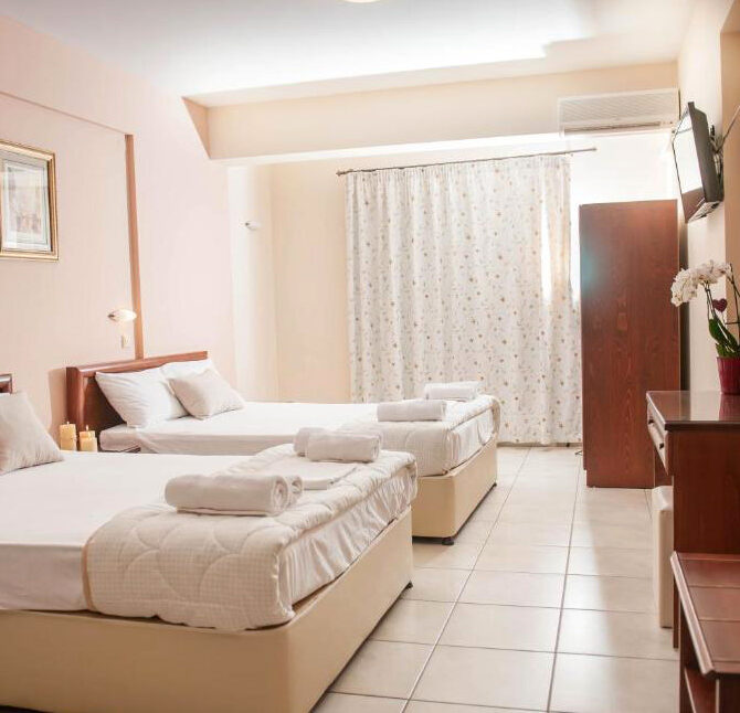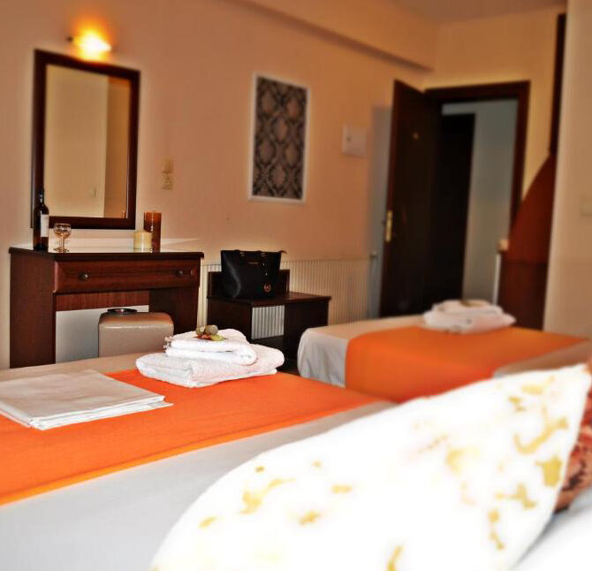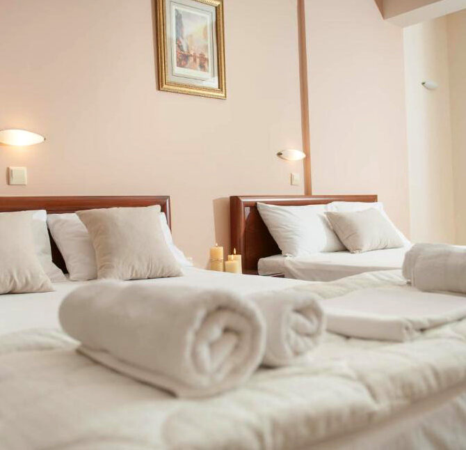 The Superior Triple and Quadruple Rooms of Hotel Vizantio offer comfort, style and stunning views of Mount Olympus. The Superior Triple Room has one large double and one single bed, while the Superior Quadruple Room has two large double beds.